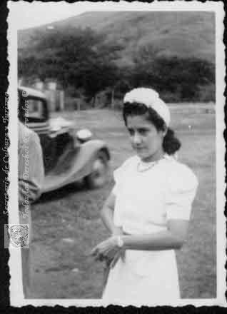 Aura Rosa Arrechea de Rico, de paseo, se observa el automóvil de la época. Santiago de Cali, fecha por definir.