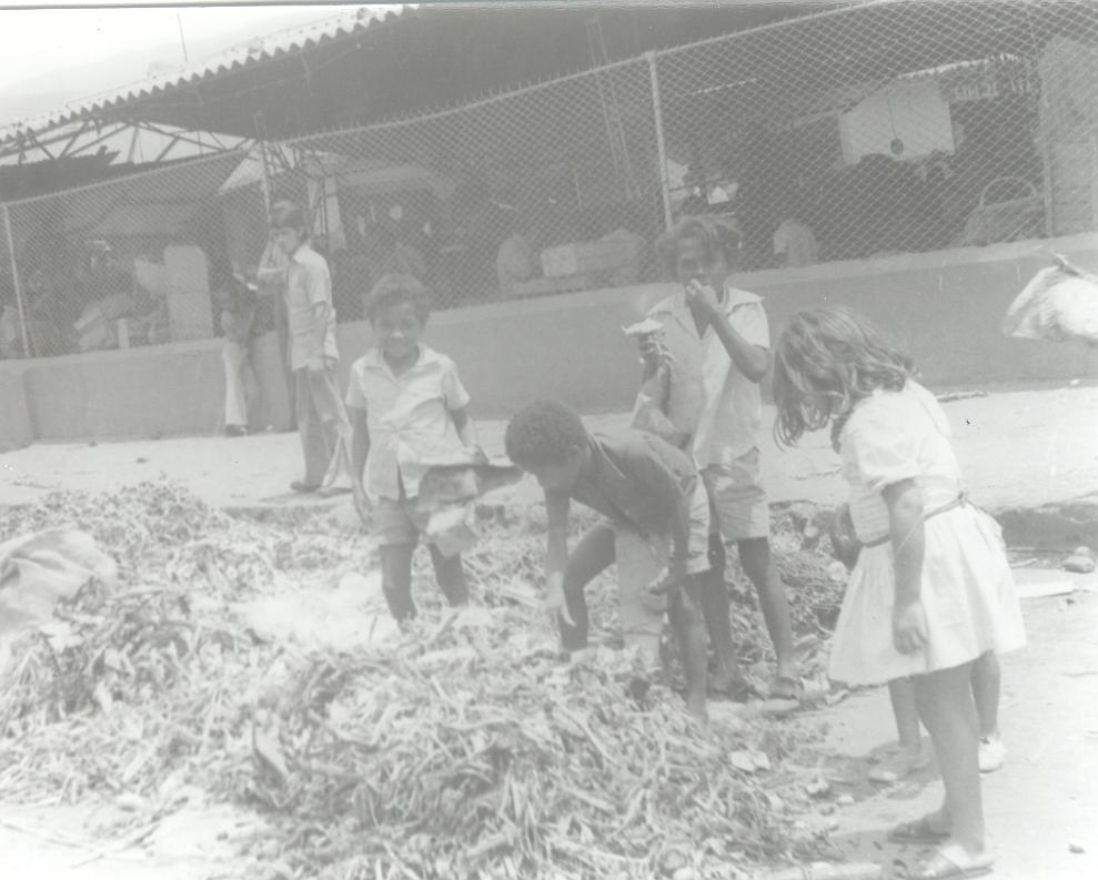 Plaza de mercado de la 9ª, niños bucando alimentos entre los restos de verduras, al final de un día de mercado. Santiago de cali, 1976.
