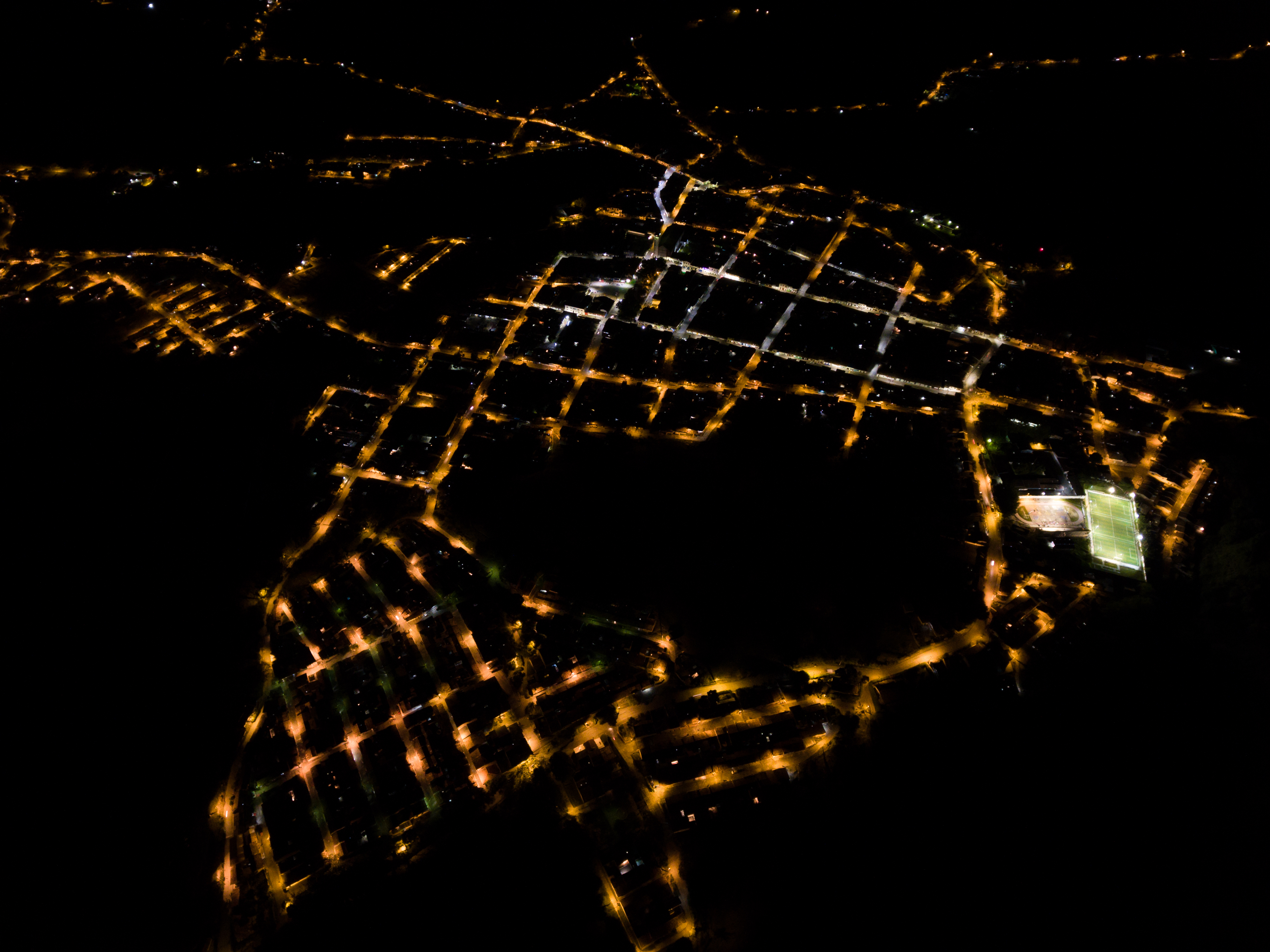 Ansermanuevo, Valle del Cauca. Fundado 15 agosto de 1539, por el Mariscal Jorge Robledo, Se convirtió en municipio por ordenanza 29 de abril de 1925. Observamos vista aérea nocturna de Ansermanuevo. Se aprecia las calles, escenarios deportivos.