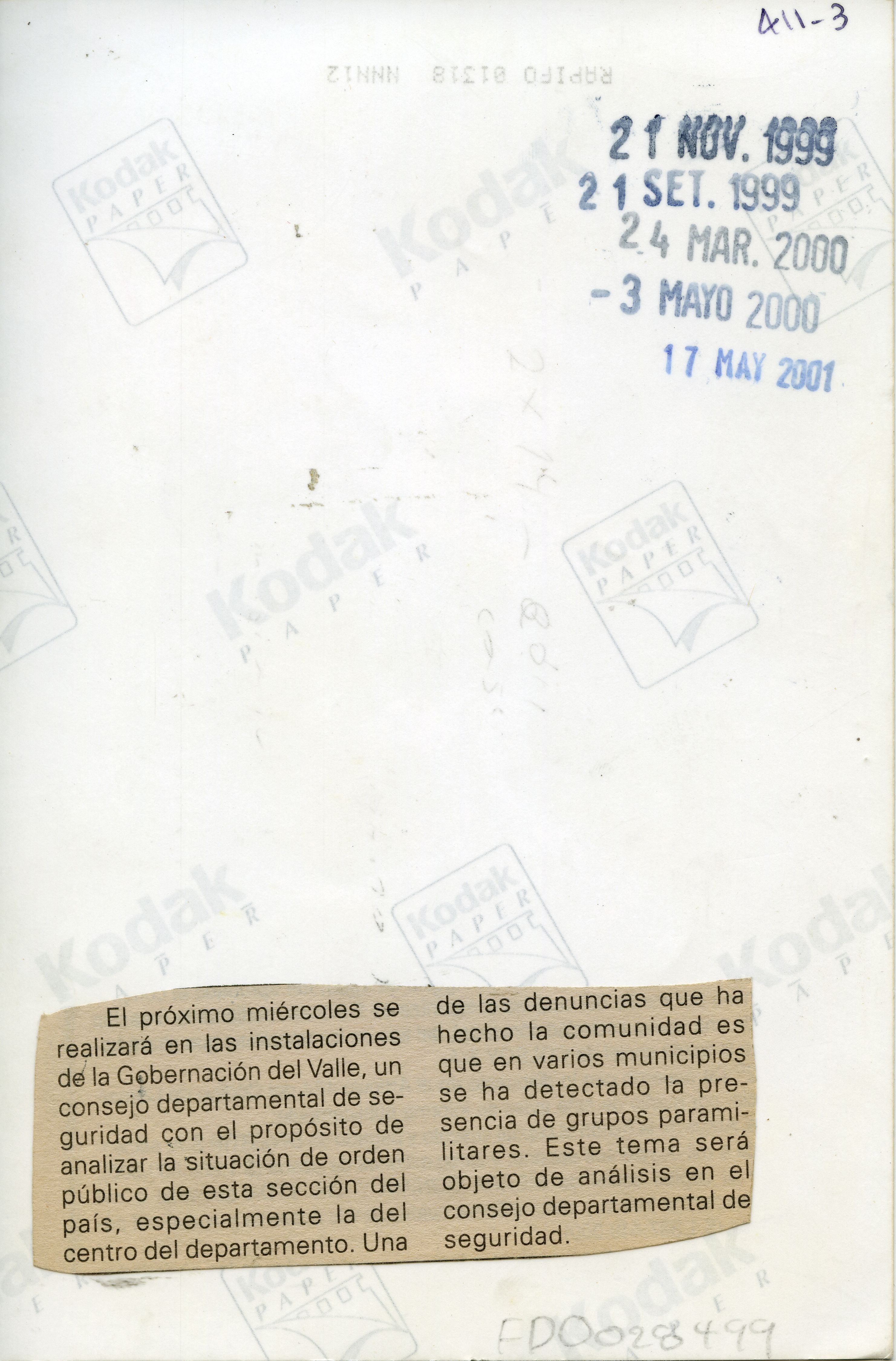 Reverso."El próximo miércoles se realizará en las instalaciones de la Gobernación del Valle, un consejo departamental de seguridad con el propósito de analizar la situación de orden público de esta sección de país, especialmente la del centro del departamento. Una de las denuncias que ha hecho la comunidad es que en varios municipios se ha detectado la presencia de grupos paramilitares. Este tema será objeto de análisis en el consejo departamental de seguridad."