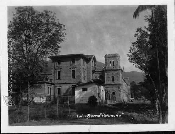 Panorámica de las instalaciones del Batallón Pichincha, su construcción se inicio en 1917, con un amplio patio central, fachadas de ladrillo a la vista con almacenes en los cuatro costados y garitas del mismo material en las esquinas. Hoy desaparecido por el falso progreso. Santiago de Cali, C. 1925.