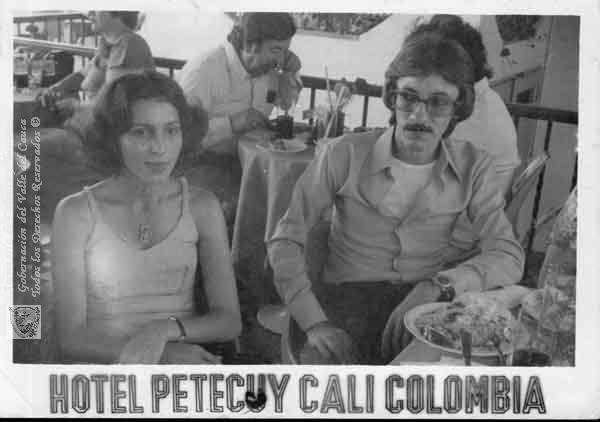 Rosa Helena Bitar y Julio Guzmán, disfrutado de un suculento almuerzo en el restaurante del Hotel Petecuy. Santiago de Cali, C.1970