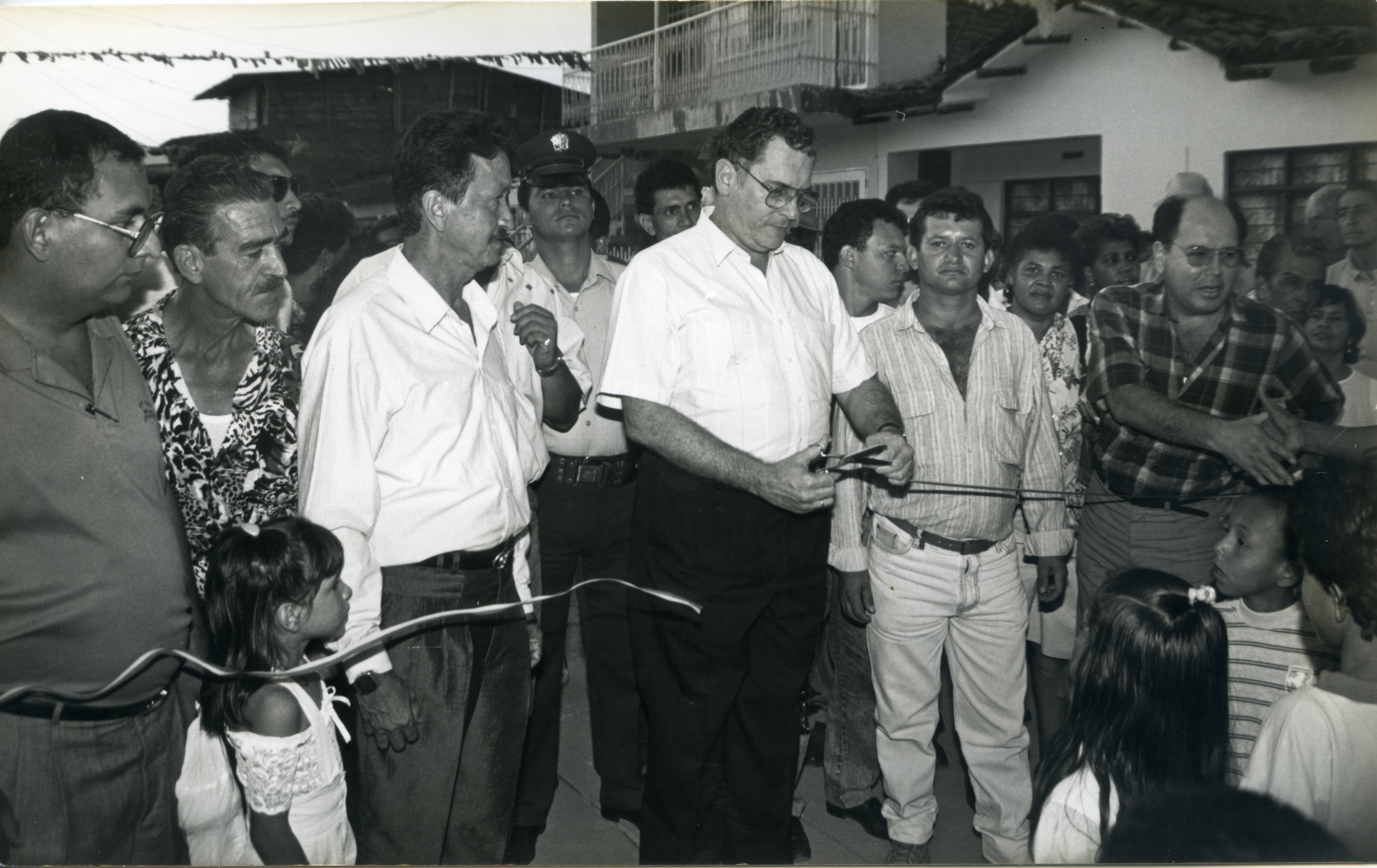 En el registro fotográfico podemos observar al Gobernador del Valle, Carlos Holguín Sardi, inaugurando junto a los habitantes del barrio Ulpiano Lloreda, un tramo importante de este sector. Al reverso de la fotografía se anexa recorte: "Pavimento comunitario. Cali, Marzo 15/93. EL gobernador del Valle, Carlos Holguín Sardi, inauguró la pavimentación de un importante tramo en el barrio Ulpiano Lloreda, donde el gobierno seccional invirtió $100 millones. Las obras fueron efectuadas por el sistema de autoconstrucción con participación del 70% del Departamento.(Foto Ivanar.Unidad de Comunicaciones.Gobernación del Valle)."