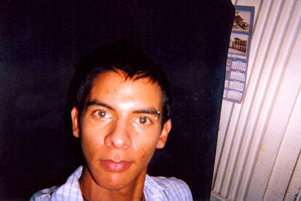 Autorretrato del autor mirando fijamente a cámara sobre fondo negro. A la derecha se ve parcialmente la pared con un calendario del Cali Histórico. Foto tomada con flash.