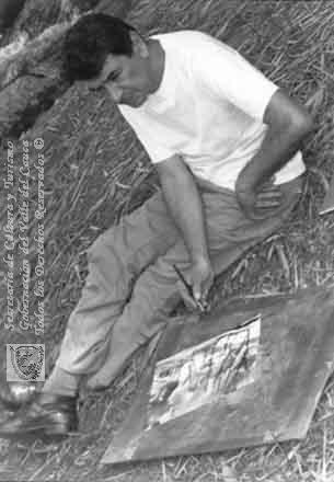 MAESTRO YESID MONTAÑA, EN LA FINCA PIEDRA RAJADA, RÍO CLARO, JAMUNDÍ, PINTANDO, INSPIRADO EN LA NATURALEZA QUE LO RODEA.