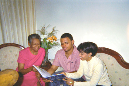 Plano Medio. Imagen tomada en el interior de una vivienda. Se observa a un grupo de personas reunidas en la sala de una casa. En el centro un hombre joven sostiene un libro, lo acompaña una mujer joven y una mujer de edad adulta. Imagen tomada con luz de flash.