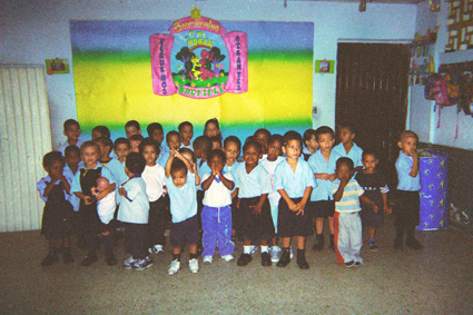 dc.description | Plano medio. Imagen tomada en el interior de una institución educativa, donde se aprecia un grupo de niños de corta edad posando para la cámara. Al fondo una bandera de color azul verde y amarillo. | spa |