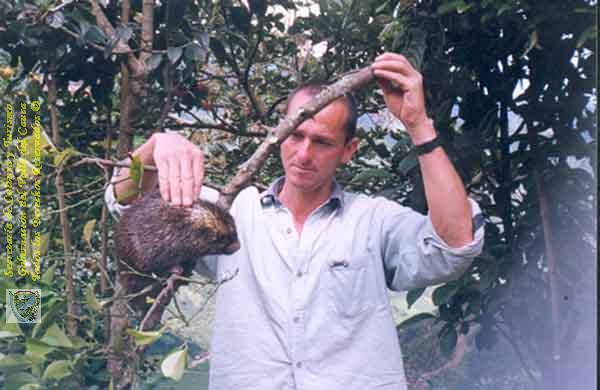 Gerardo Galvis con un erizo , Vereda Santa Helena, finca Pradera. El Aguila es un paraíso natural del Valle del Cauca, con grandes reservas y sitios naturales ricos en biodiversidad, para el disfrute de los vallecaucanos. C. 2000.