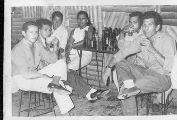 Manuel Alzate reunido con sus amigos y amigas en una fuente de soda del municipio. Cartago, 1969.