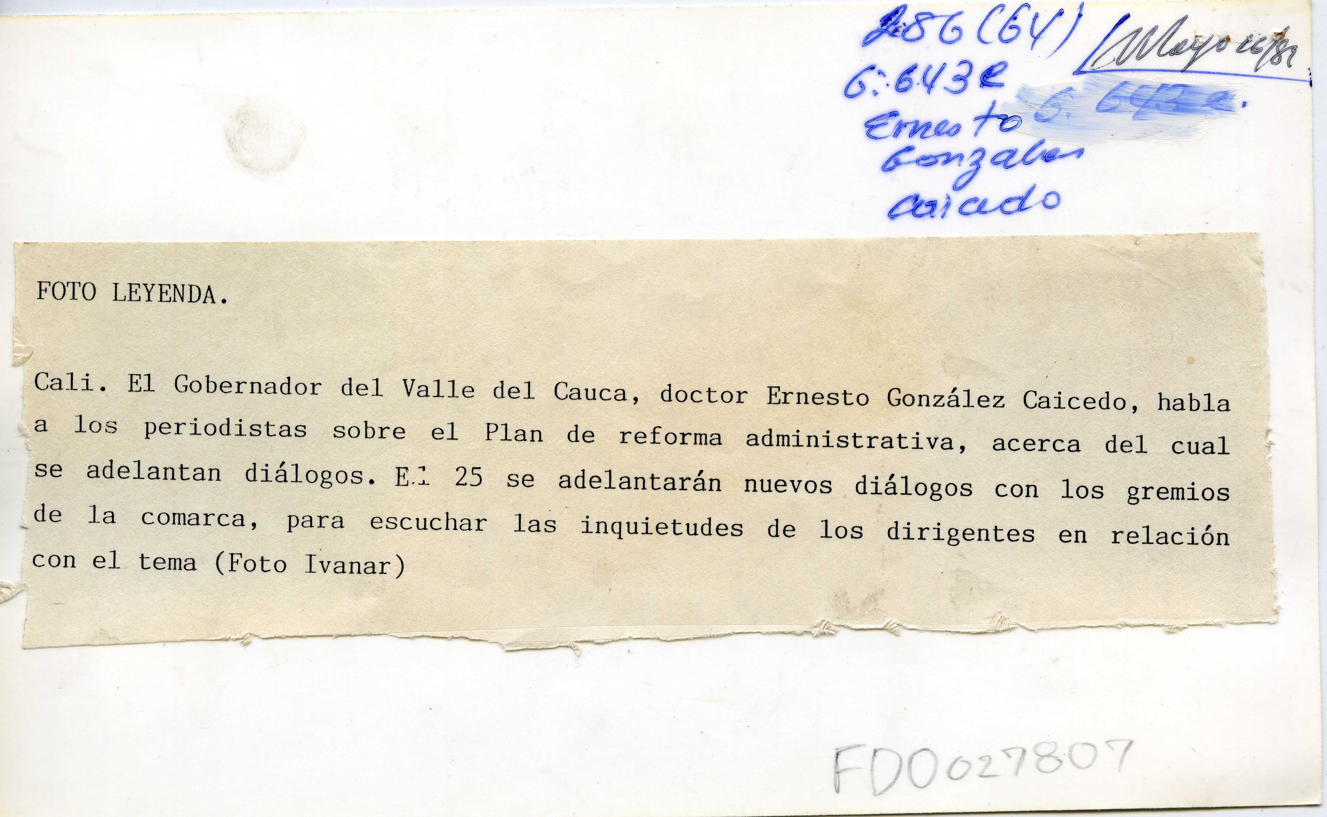 | dc.description.abstract | "Reverso: FOTO LEYENDA. Cali. El gobernador del Valle del Cauca, doctor Ernesto González Caicedo, habla a los periodistas sobre el plan de reforma administrativa, acerca del cual se adelantan diálogos. El 25 se adelantarán nuevos diálogos con los gremios de la comarca, para escuchar las inquietudes de los dirigentes en relación con el tema." | spa |
