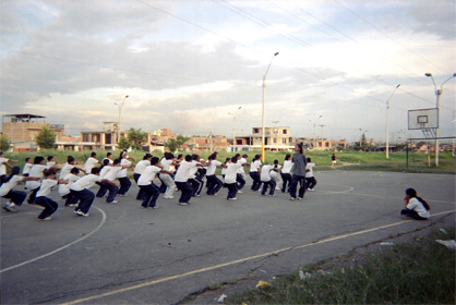 Plano general toma realizada en exterior, en una cancha de baloncesto, donde hay un grupo de jóvenes vestidos con el uniforme de un colegio, haciendo deporte, guiados por un instructor. Al fondo la fachada de varias viviendas.