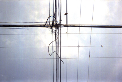 Convergencia de líneas en cableado eléctrico. Algunas torcazas sobre los cables. Plano medio. Ángulo Nadir.