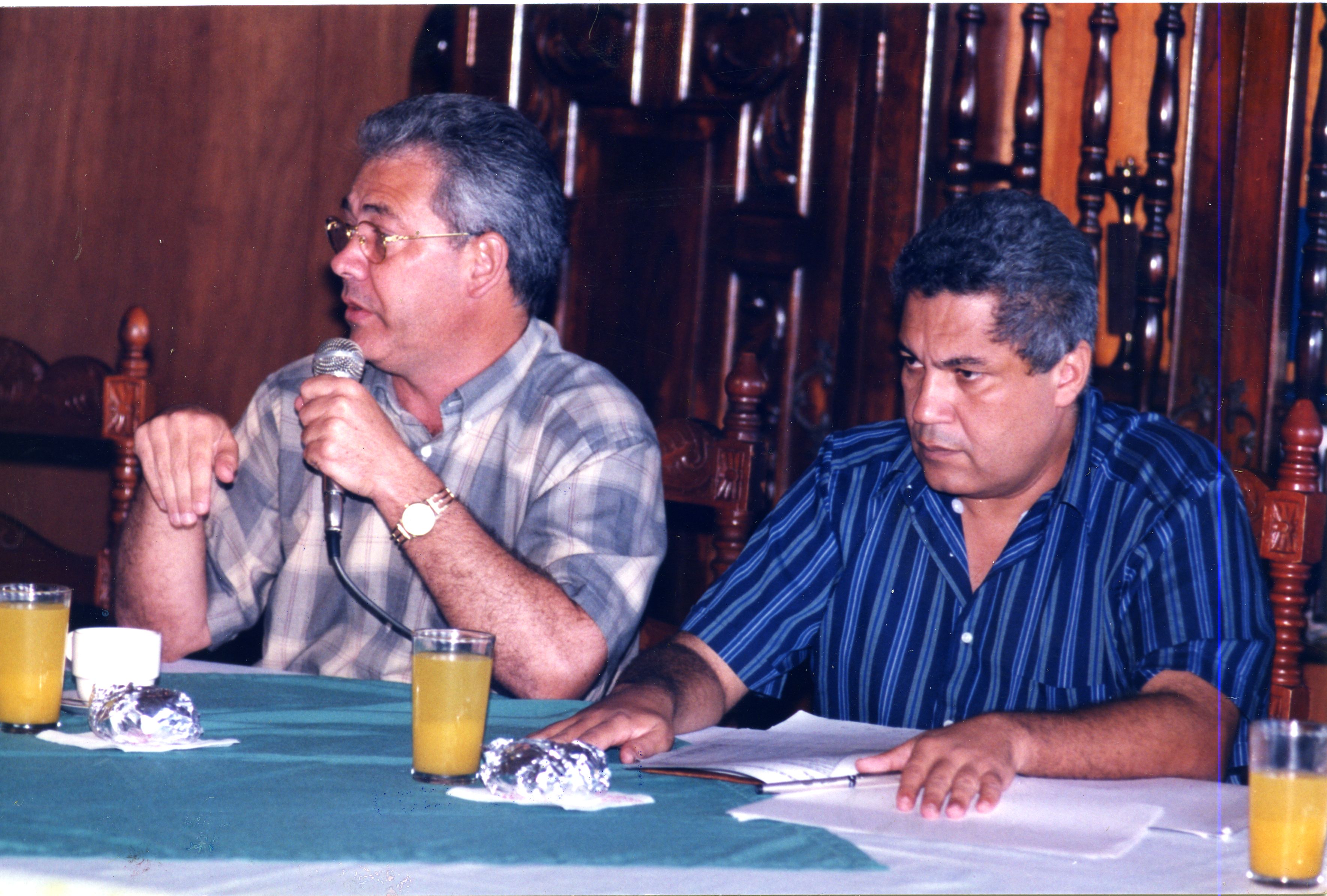 Fotografía plano medio horizontal de Úlber Vásquez Lenis, gerente de Infipal y Alcalde Cívico de Rozo. En la fotografía aparece de vestido informal acompañado de otra persona en una mesa, con un micrófono y algunas bebidas y comida.