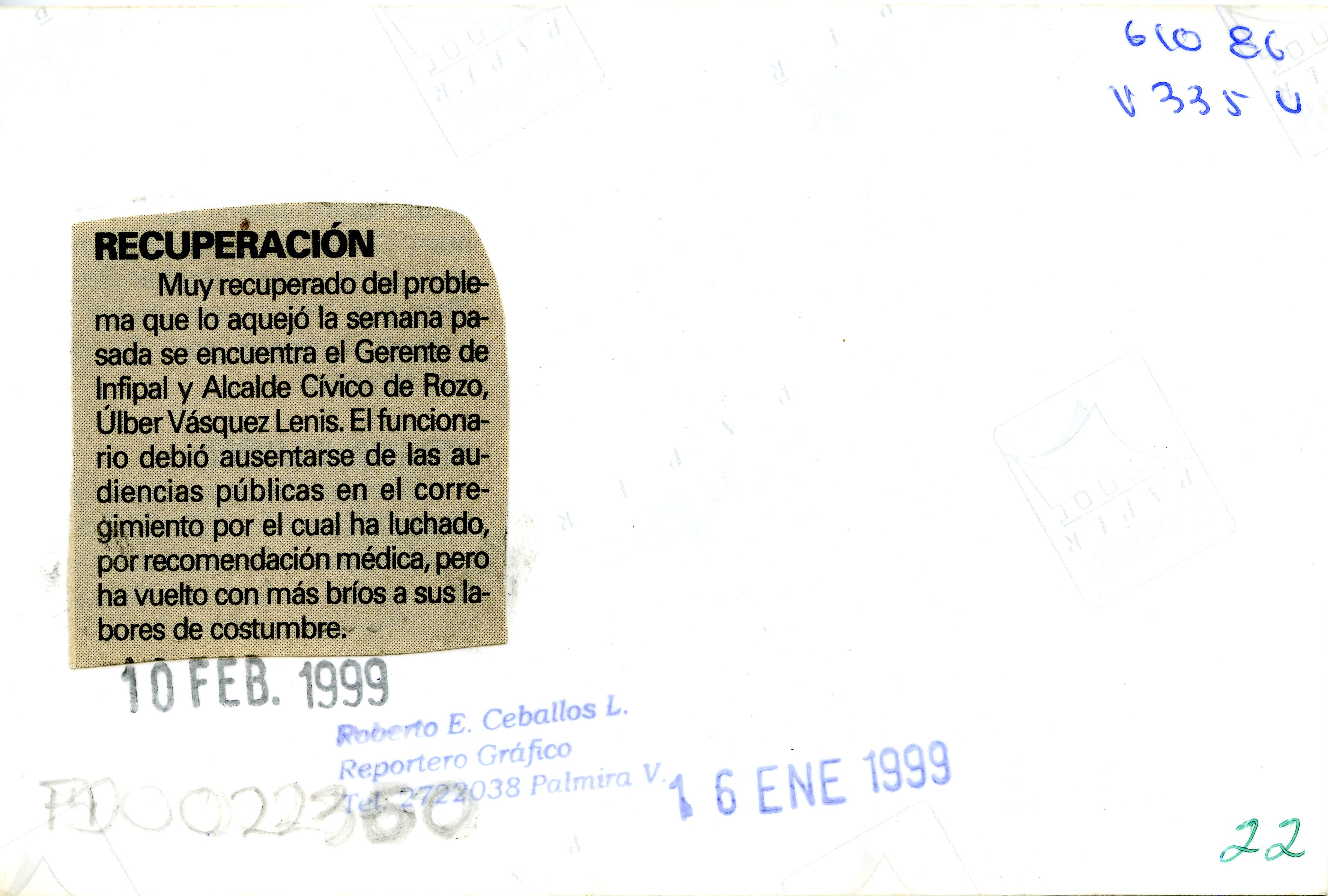 Se anexa recorte: "RECUPERACIÓN. Muy recuperado del problema que lo aquejó la semana pasada se encuentra el gerente de Infipal y Alcalde Cívico de Rozo, Úlber Vásquez Lenis. El funcionario debió ausentarse de las audiencias públicas en el corregimiento por el cual ha luchado, por recomendación médica, pero ha vuelto con más bríos a sus labores de costumbre."