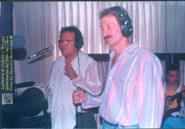 En la grabación del Himno de Alcalá, el señor Rodrigo Jaramillo y Fidel Vallejo. Alcalá, C. 1997.