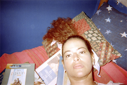 Autorretrato. Libros al lado de la autora sobre su cama. Imagen tomada con flash. Primer plano.
