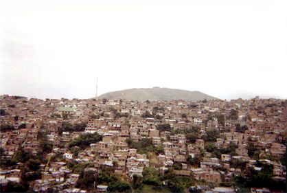 Plano general. Efecto de contraste entre las construcciones y el cielo. Sobresale una naciente montaña entre el conjunto de casas.