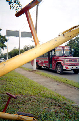 Primer plano. Exterior día. Forma cilíndrica en sentido diagonal en primer plano. Autobús en segundo plano. Perspectiva lineal en sentido oblicuo en bloque inferior.