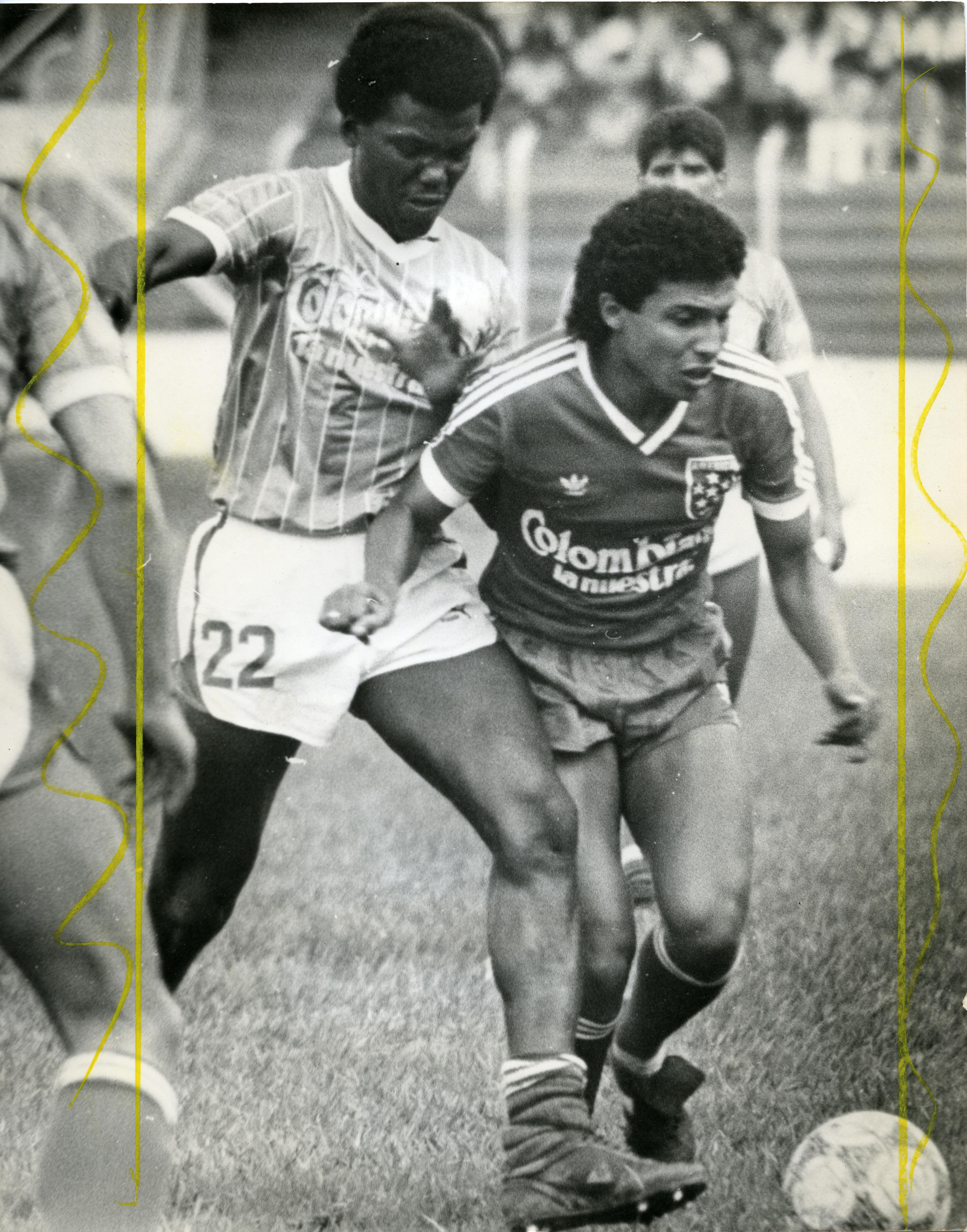 Partido de Fútbol realizado en el estadio Pascual Guerrero entre América de Cali y Millonarios. En la gráfica se aprecia disputa del balón jugador Alex en el campo de juego. Observamos público en la tribuna