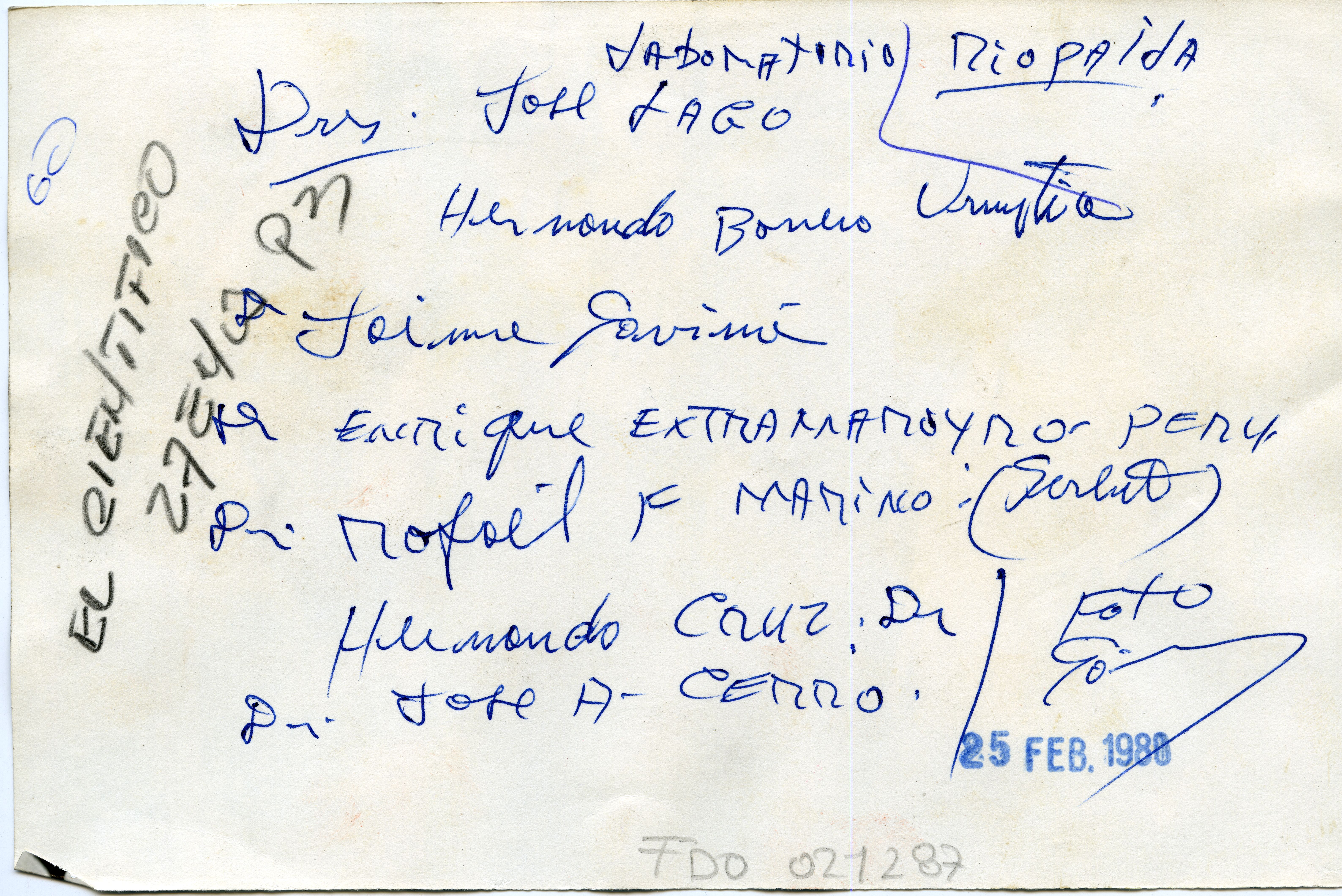 Laboratorio del Ingenio Riopaila. Se aprecia las siguientes personas: Dr José Lago, Hernando Borrero U. Jaime Gavino, Enrique Extramandyno P. Rafael F Marino, gerente, Hernando Cruz, Dr José A.