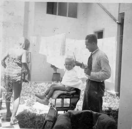 Los salones de belleza son una moda reciente por ello no es extraño que el oficio de cortar el pelo se hiciera anteriormente en la casa de cada cliente, aqui Ignacio Zamora en su oficio, 1952