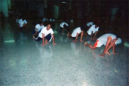 Imagen tomada en el interior de una institución educativa, donde se puede apreciar un grupo de jóvenes haciendo ejercicios de estiramiento. Toma realizada con luz de flash. Plano medio.