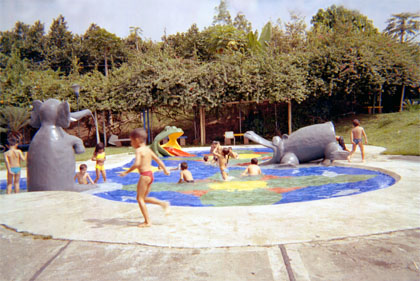 PLano de contexto. Exterior día. Niños en piscina. Realce de figuras animadas y variedad de colores. Forma circular predominante. Alegría y movimiento.