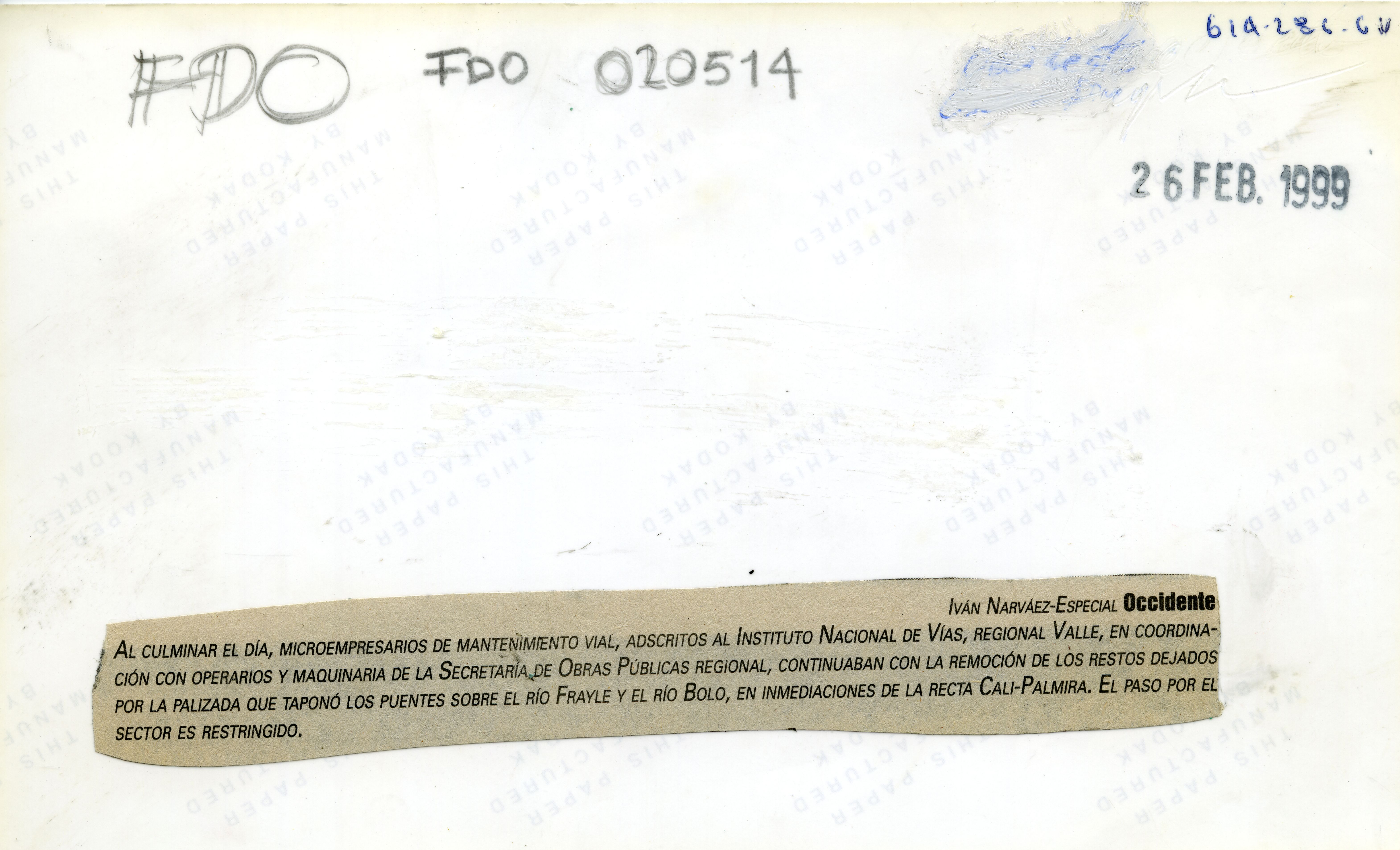 | dc.description.abstract | Reverso: Al culminar el día, microempresarios de mantenimiento vial, adscritos al Instituto Nacional de vías, Regional Valle, en coordinación con operarios y maquinaria de la secretaria de Obras Públicas Regional, continuaban con la remoción de los restos dejados por la paliza que taponó los puentes el Río Frayle y el Río Bolo, en inmediaciones de la recta Cali - Palmira. El paso por el sector es restringido | spa |