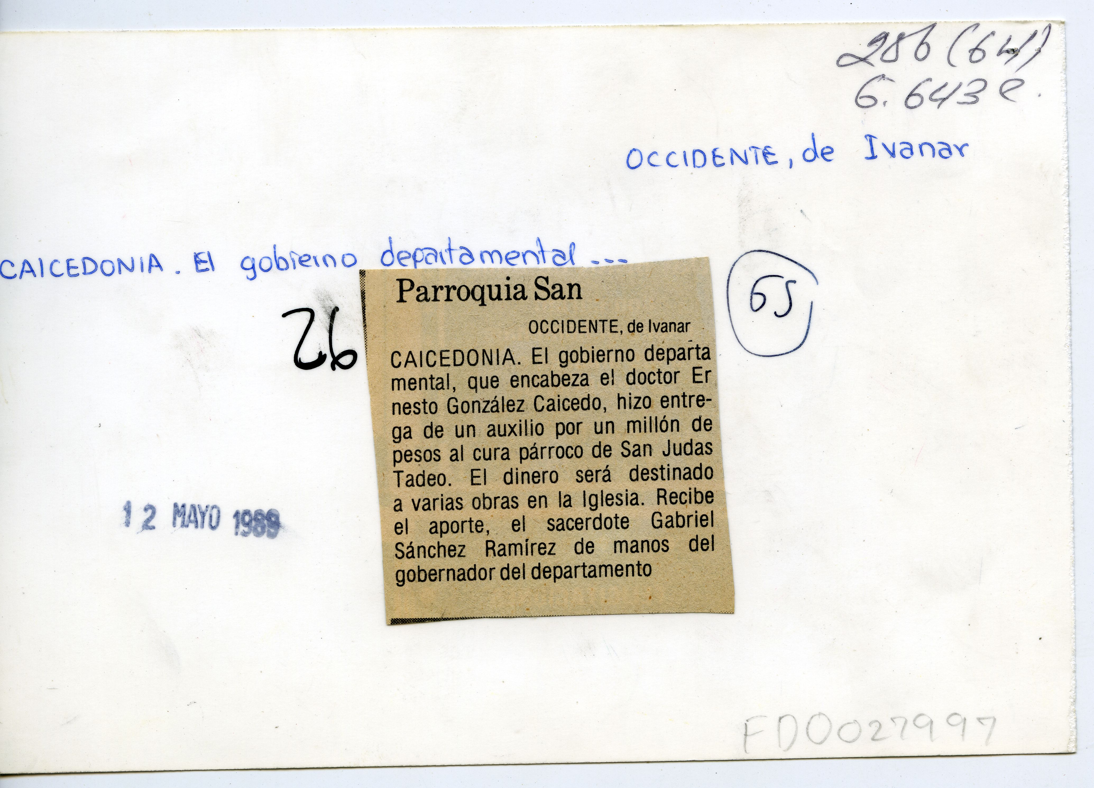 Dentro de la composición gráfica de la fotografía es posible observar una reunión en caicedonia, entre el gobernador Ernesto González Caicedo junto a otras personas. En la junto el gobernador hace entrega de un auxilio económico al cura párroco de San Judas Tadeo, quien recibe el monto es el sacerdote Gabriel Sánchez Ramírez.