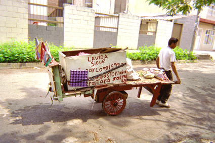 Girón Casadiego, T. M. (2005). Imagen de un hombre cargando una carretilla, en la cual hay un cajón de color blanco con un letrero pintado de rojo que hace alusión b al salmo 23. Santiago de Cali: Biblioteca Departamental Jorge Garces Borrero.