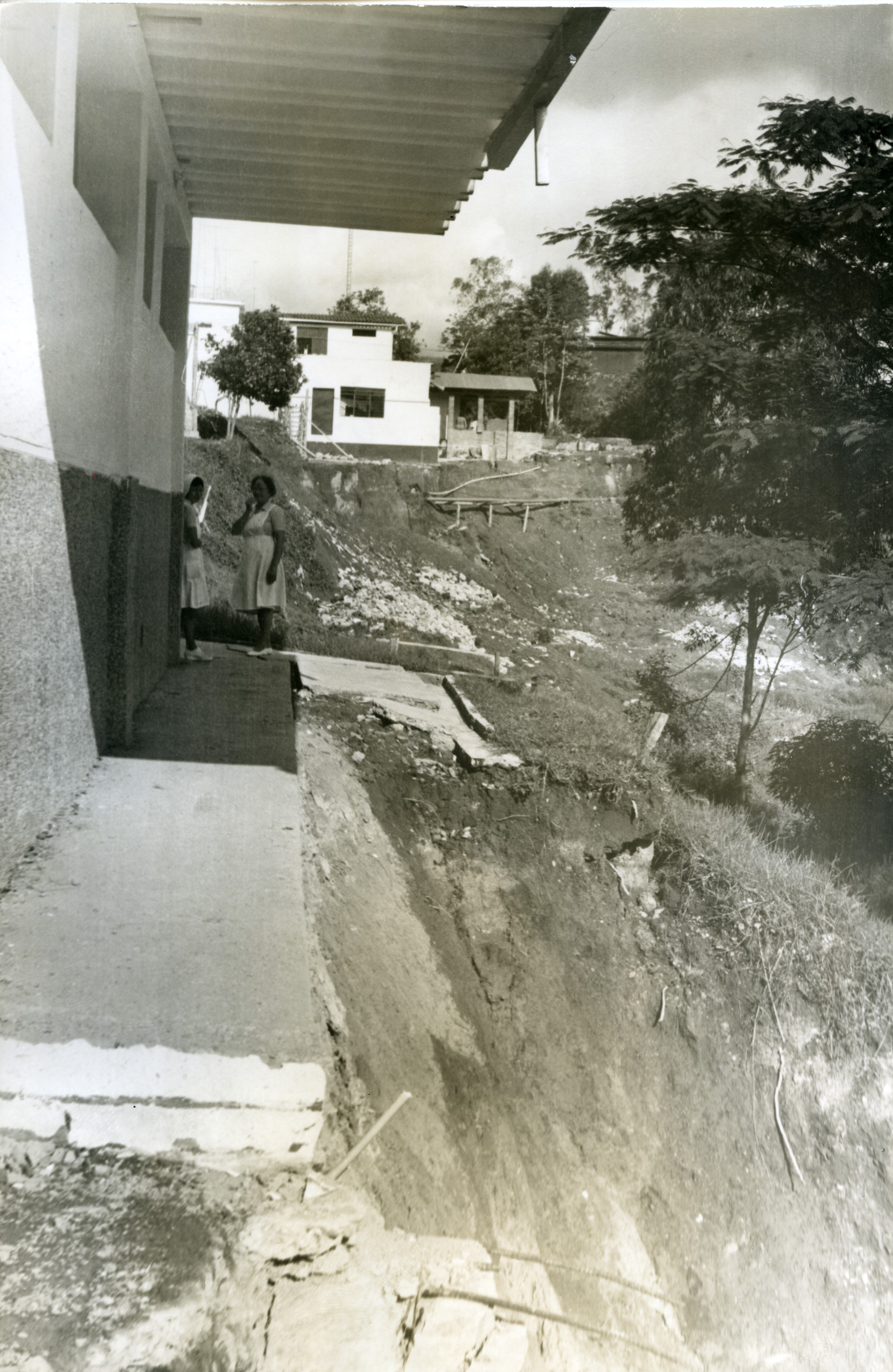 Al reverso de la fotografía se anexa el reportaje del periódico: "Esta sección donde opera la lavandería, igualmente en peligro, también será demolida. Al fondo aparece la tubería de agua y alcantarillado que quedó descubierta cuando se desplomó parcialmente la sala de pediatría". Se observan dos enfermeras observando lo sucedido.