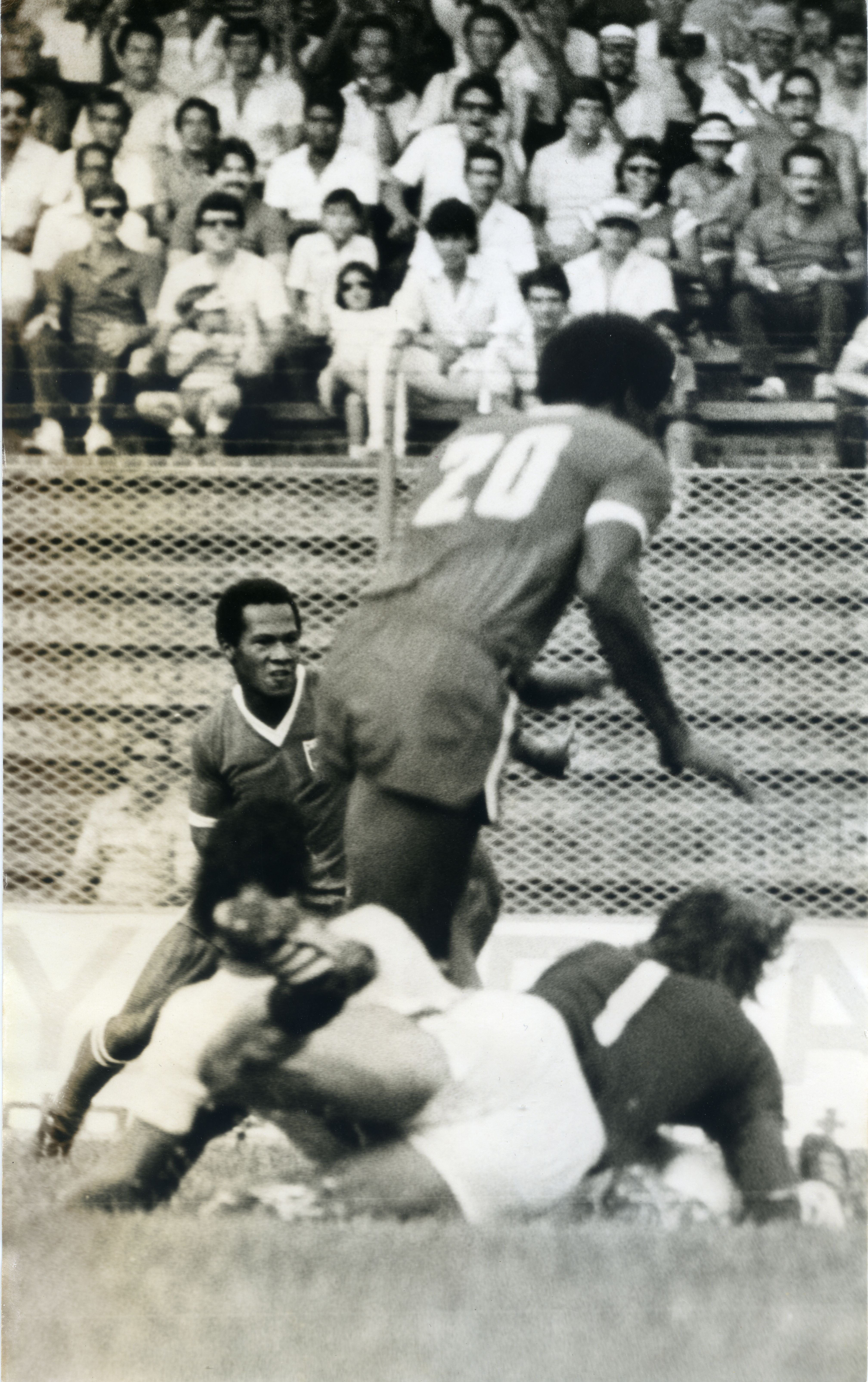Foto de plano completo de tres jugadores de futbol, donde se puede ver claramente a uno de estos en el piso, mientras los otros dos están de pie, uno de ellos tiene en su espalda el numero veinte, el jugador que se encuentra en el césped tiene el numero uno; en las graderías se puede ver a varias personas observando el cotejo