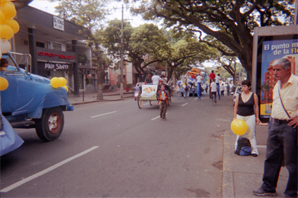 Secuencia. Celebración de los 15 años de la Fundación del Artista Colombiano. 18 de junio de 2005. Avenida sexta. En la imagen varios vehículos adornados para el evento transitan por la avenida sexta. En primer plano un señor ubicado al lado derecho observa la escena sin prestar atención.