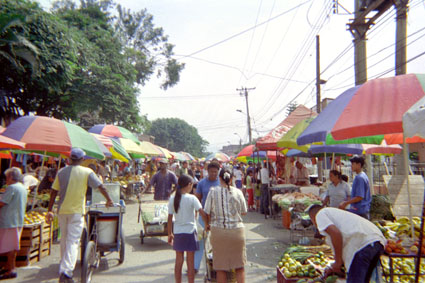 Plano medio. Imagen tomada en exterior, donde se puede apreciar una vía pavimentada en la cual se ha instalado un mercado ambulante. A cada extremo varios parasoles de colores variados.
