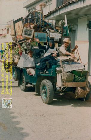 Concurso del Yipao según la sonoridad dada al concurso por los sevillanos. Los jeep Willis son los camperos más utilizados por los concursantes. Sevilla. 1990.