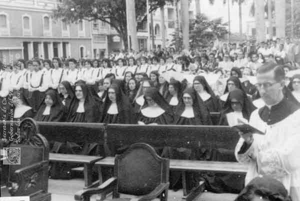 Misa campal. Se observa un grupo de alumnas al fondo y en primer plano un grupo de monjas. Cartago. C. 1970.