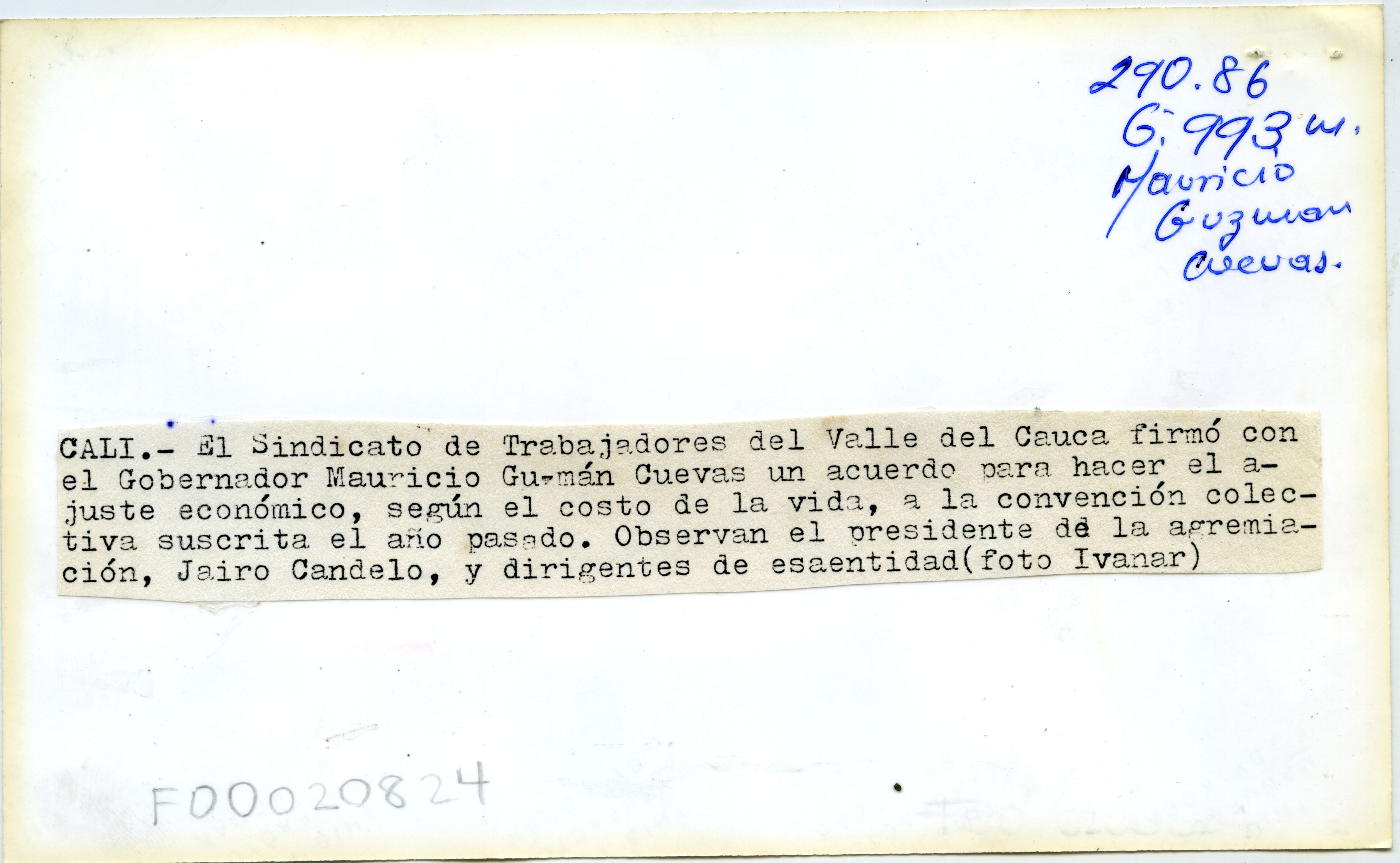 Reverso: Cali. El Sindicato de Trabajadores del Valle del Cauca firmó con el gobernador Mauricio Guzmán Cuevas un acuerdo para hacer el ajuste económico, según el costo de la vida, a la convención colectiva suscria el año pasado. Observa el presidente de la agremiación , Jairo Candelo, y dirigentes de esa entidad ( Foto Ivanar )