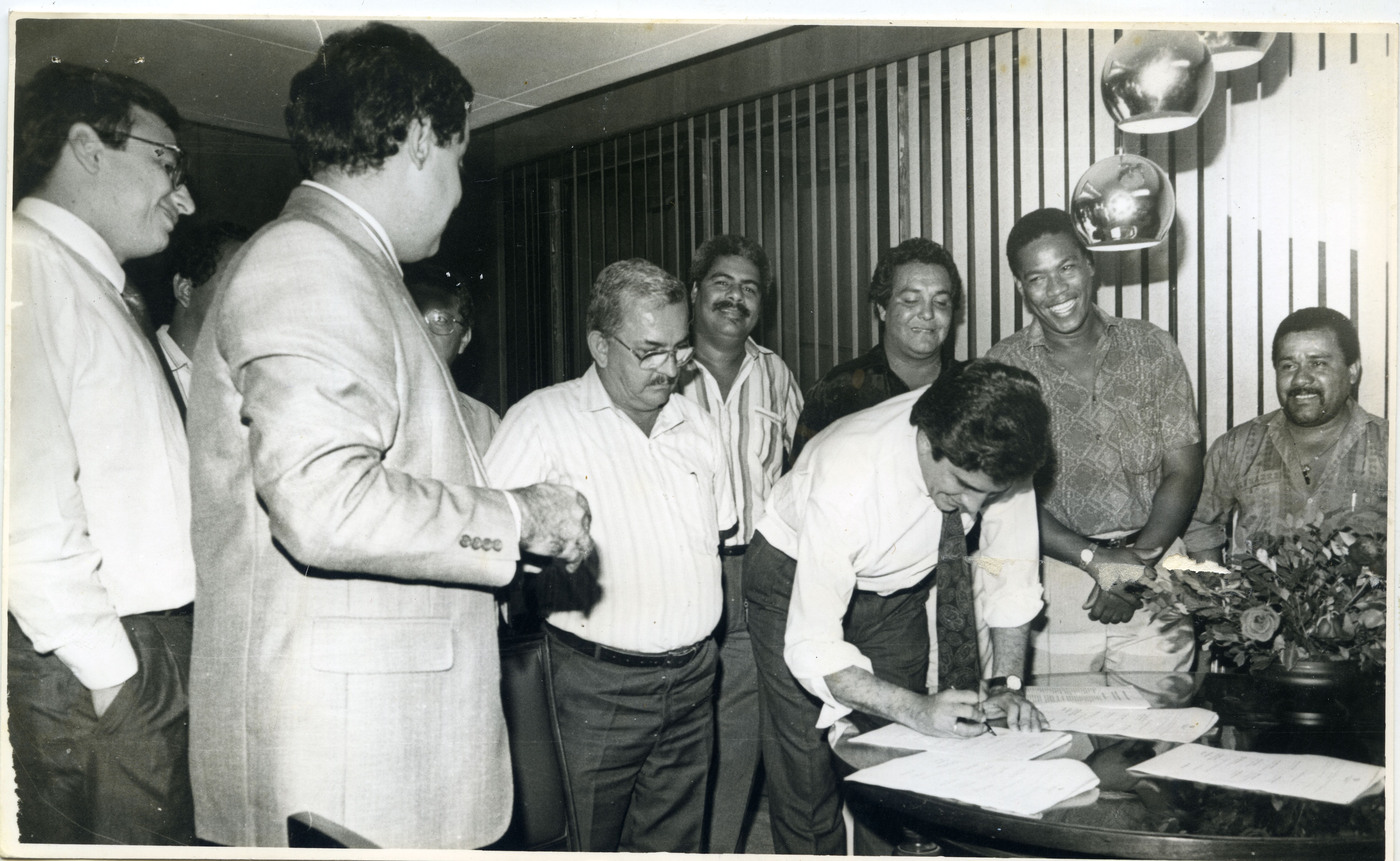 El Sindicato de Trabajadores del Valle del Cauca, firmó con el gobernador Mauricio Guzmán Cuevas un acuerdo para hacer el ajuste económico. Observa el presidente de la agremiación, Jairo Candelo y dirigentes