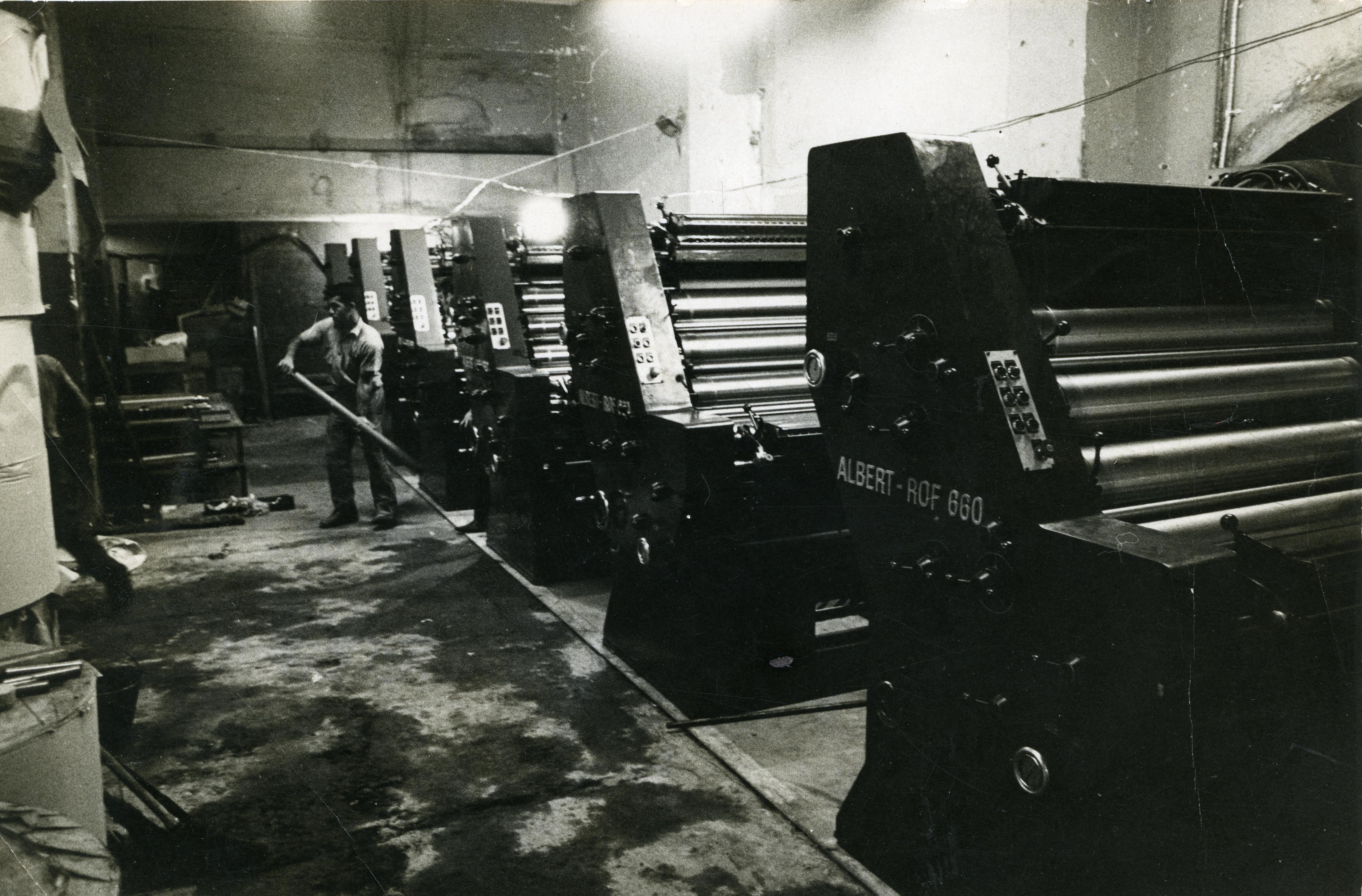 En la gráfica se aprecia Máquinas de imprenta rotativa y en la foto se aprecia a un operario trabajar en la máquina con inscripción "ALBERT ROF 660", propiedad de Diario Occidente
