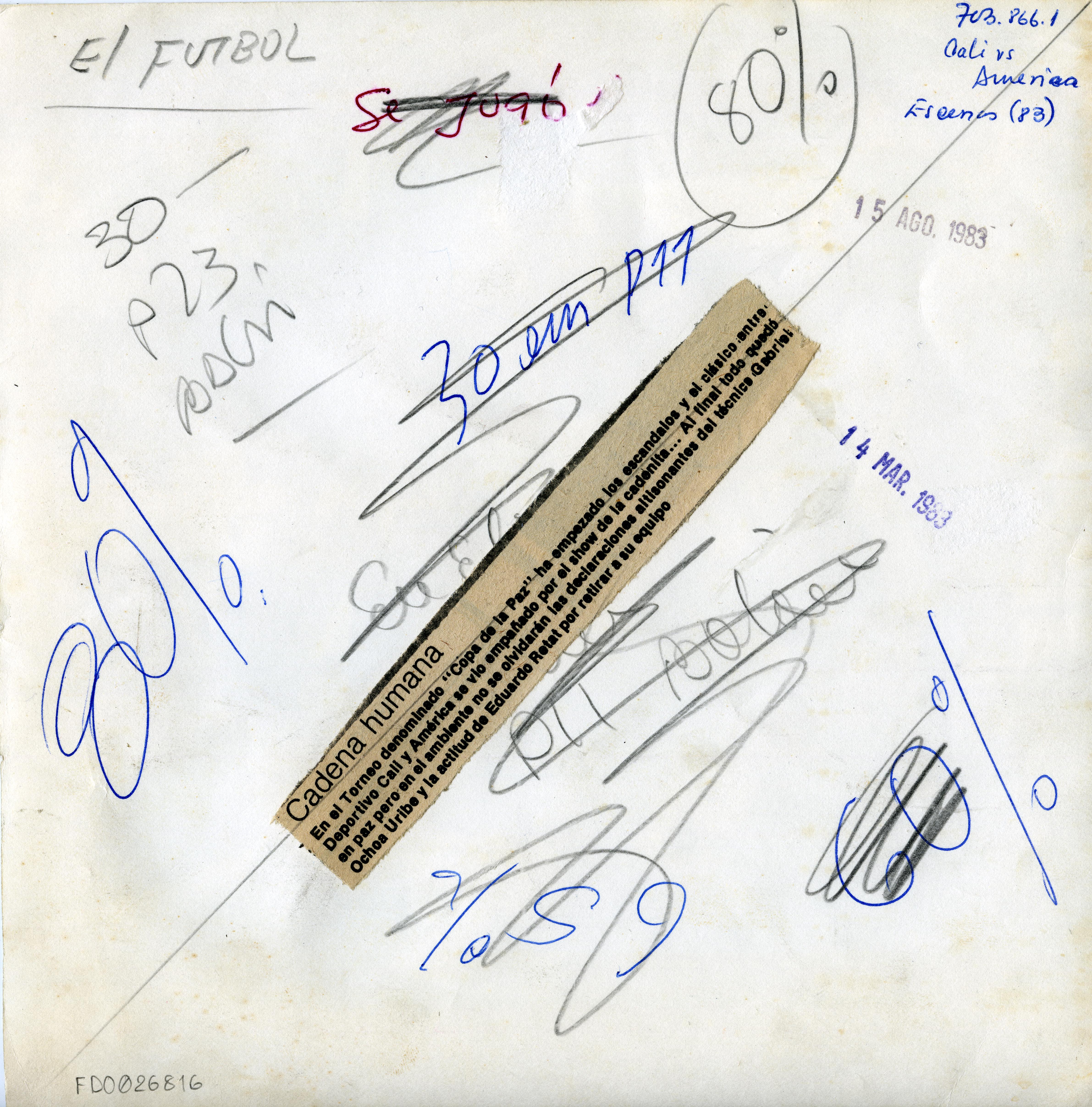 Reverso: Cadena humana. En el Torneo denominado "Copa de la Paz" ha empezado lo escándalos y el clásico entre Deportivo Cali y América se vio empañado por el show de la cadenita... Al final todo quedó en paz pero en el ambiente no se olvidarán las declaraciones altisonantes del técnico Gabriel Ochoa Uribe y la actitud de Eduardo Retat por retirar a su equipo.