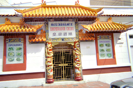 Plano Medio. La fachada de un local comercial con un estilo arquitectónico y decorativo asiático se destaca notablemente por el uso de colores vistosos como el rojo y formas mitológicas como el dragón.