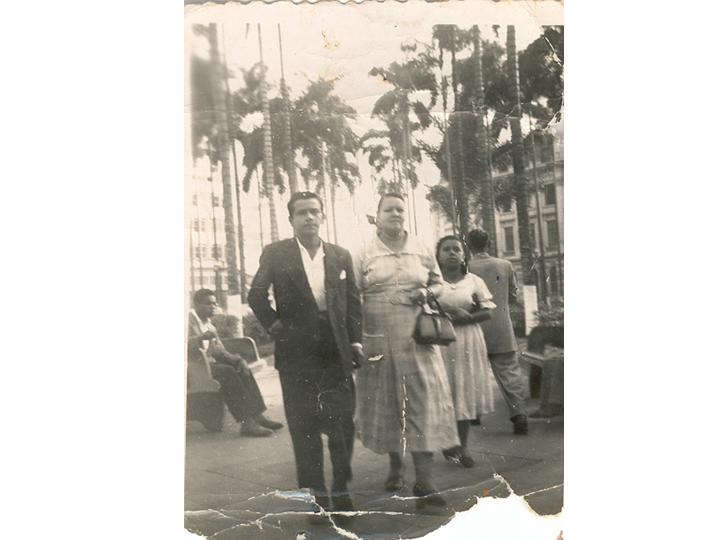 Ernestina Franco, Judith Franco y Jorge Humberto Martínez, de paseo en la Plaza Cayzedo. Santiago de Cali, 1955.