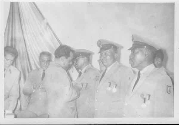 Imposición de condecoraciones a los bomberos del cuartel de Buenaventura: Capitán Marcos Montaño Salazar, Cabo Luís Paz Olmedo, Capitán Ramón Fong Mosquera, Capitán Ulpiano Vega Truque y algunos bomberos de Cali. Buenaventura, 1960.