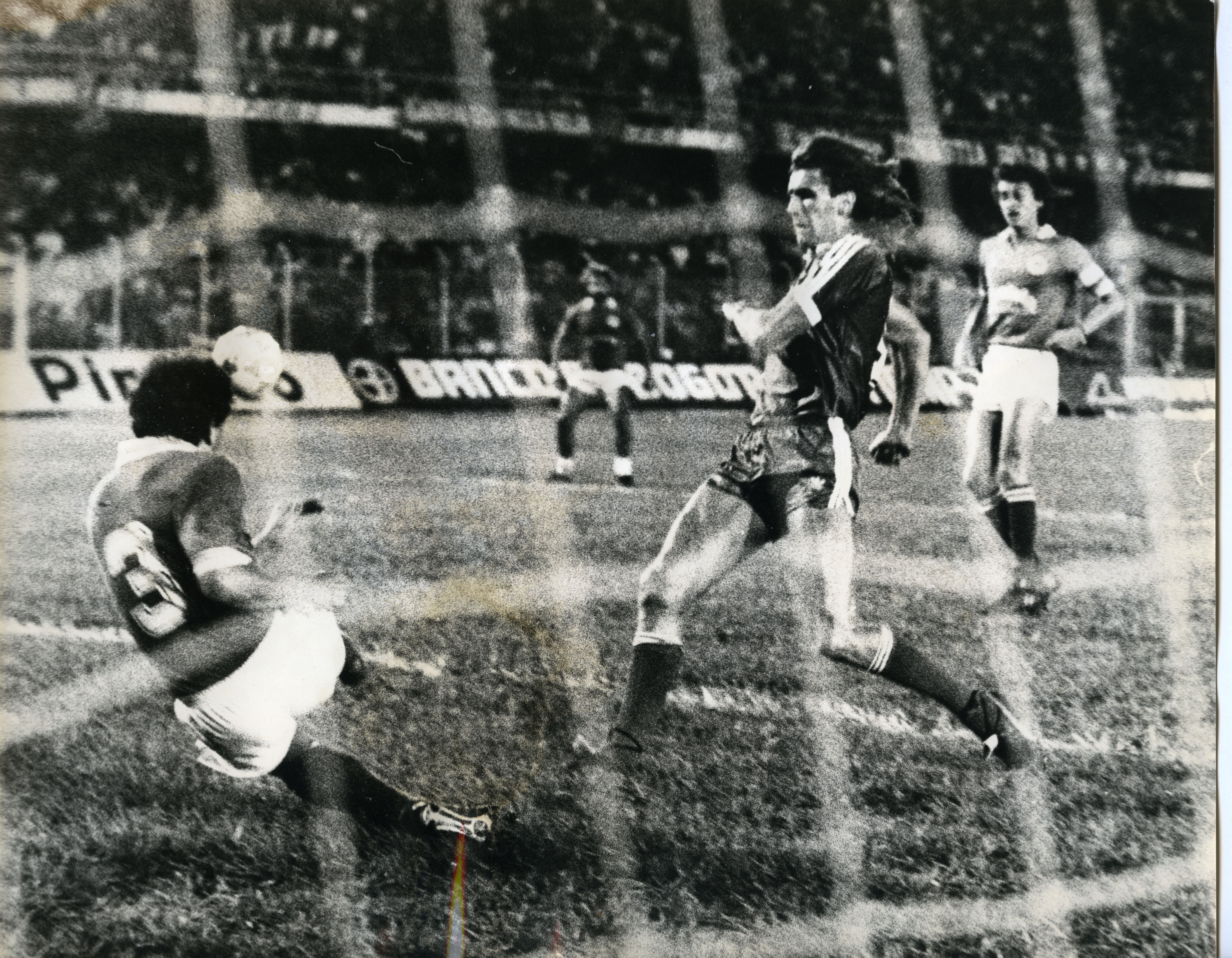 Al reverso de la fotografía se anexa recorte: Occidente de Luis López. Escobar despeja de pierna izquierda en posición difícil el remate a corta distancia de Willington Ortiz, Gareca llegá tardío al remate