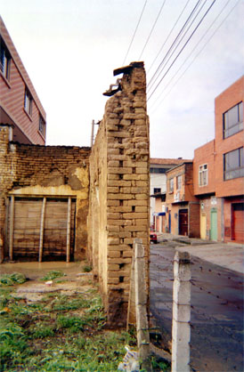 Primer plano. Casa destruída. División en dos laterales por estructura en adobe. Contraste entre las edificaciones contemporáneas y clásicas. Contraste de texturas y formas.