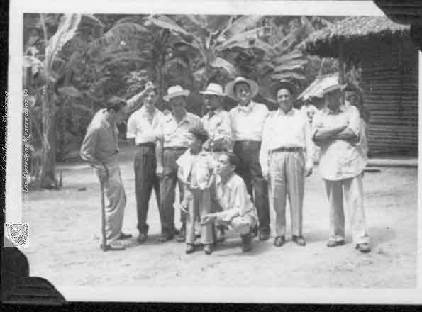 Augusto Betancourth, Luis Ospina, Alfonso Villafañe y Juan Bautista Vigoya reunidos en la casa paterna con familiares, vecinos y amigos, al calor de un buen sancocho de gallina. Esta es una tradición muy vallecaucana. Roldanillo, C.1950.