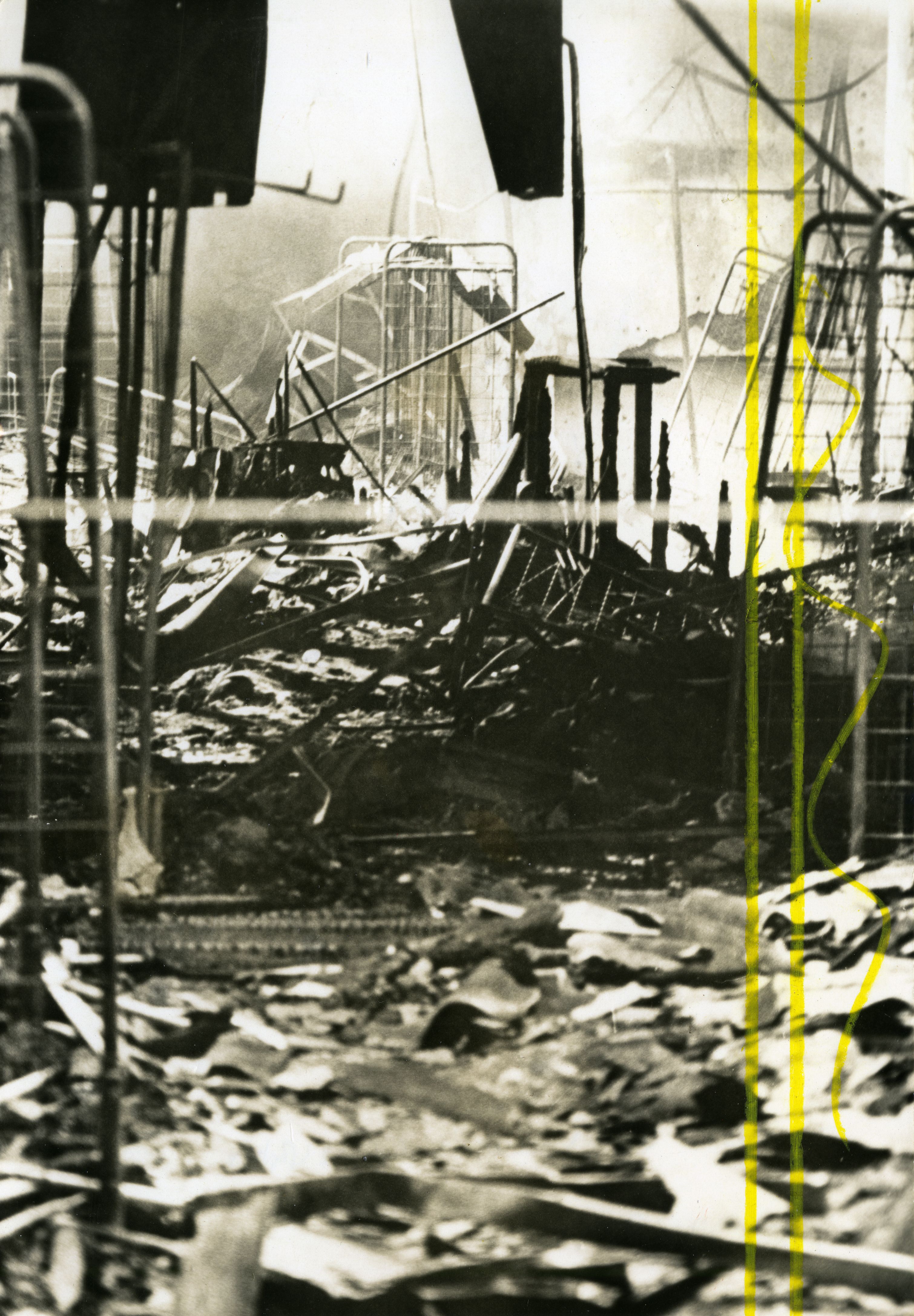 Al reverso de la fotografía se anexa recorte: Sólo hierros retorcidos y humeantes se aprecian en uno de los niveles de La 14 arrasada ayer por un incendio. La pérdidas sobrepasan los mil millones de pesos. Occidentede, William Gaviria