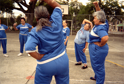 En primer plano se observan señoras pertenecientes a un grupo de la tercera edad en el barrio Benjamín Herrera. Al fondo zona verde. Exterior día.