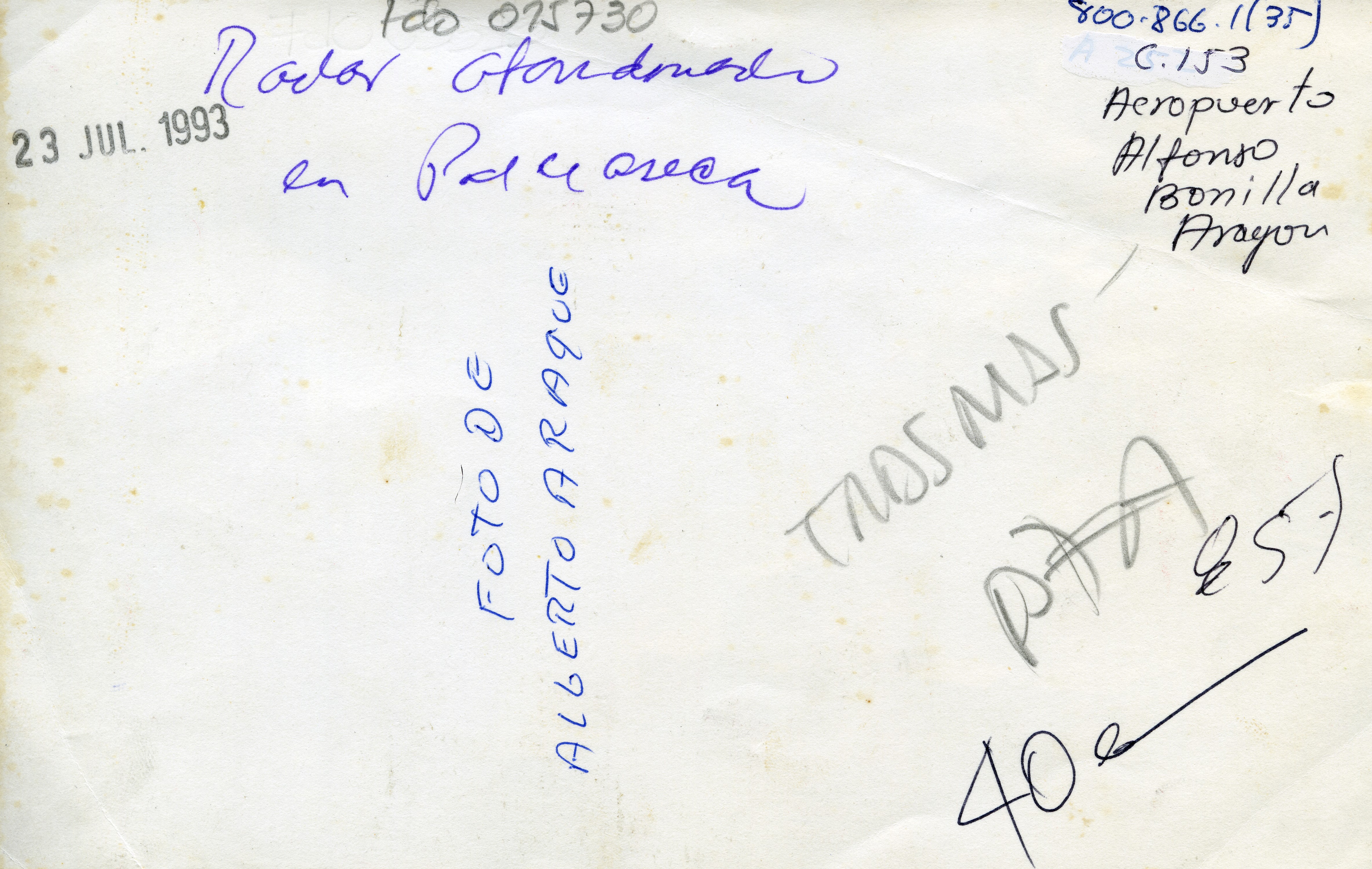 En la fotografía se observa lo que aparentemente es el descargue de mercancía o los envíos que se hacen en el aeropuerto. Al reverso dice: ¨Radar abandonado en Palma Seca¨