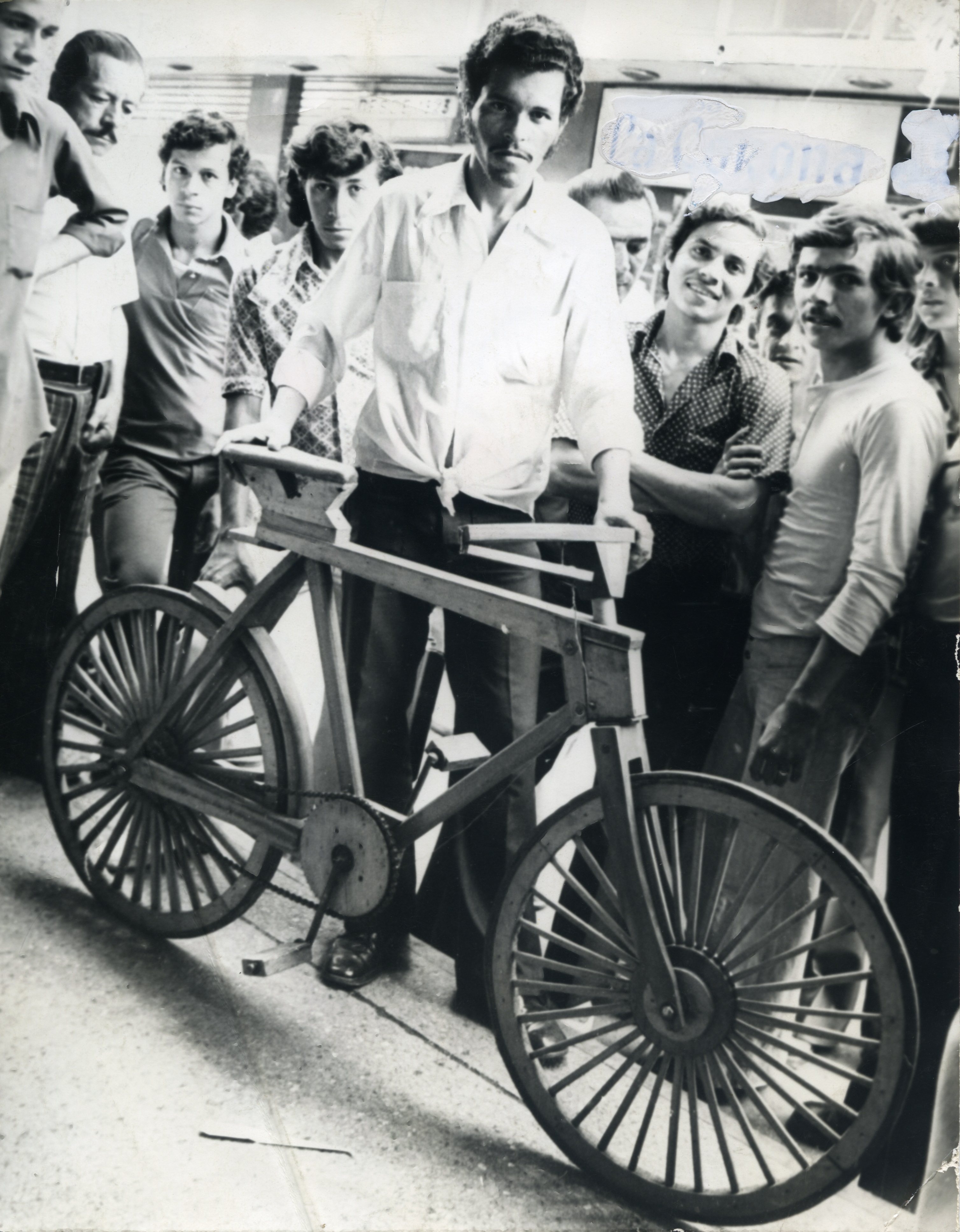 Grupo de hombres en la calle observando la bicicleta. De la serie "Bicicletas". Esta gráfica muestra un modelo de bicicleta fabricado en madera.